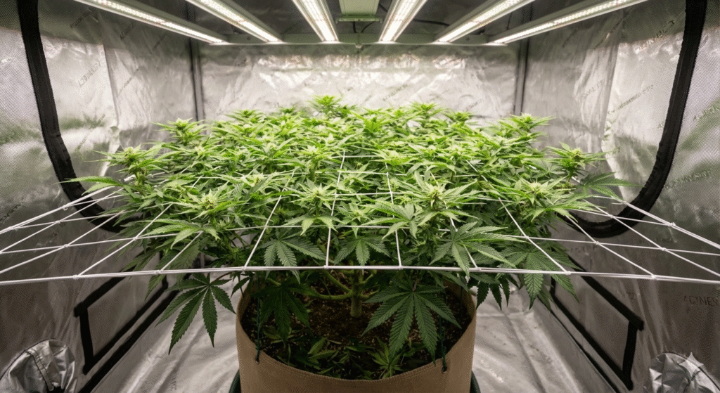- The SCROG (Screen of Green) Method: This is arguably the best technique for Jokerz. By using a trellis net to spread the canopy horizontally during veg and early flower, you ensure every bud site receives equal light intensity. This turns what would be lower “popcorn buds” into dense, A-grade flowers.